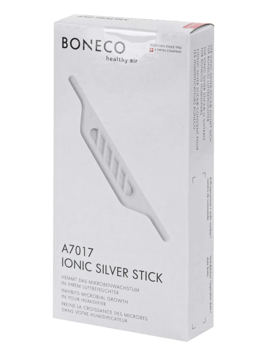 Boneco A7017 Ionic Silver Stick — специальный антимикробный серебряный стержень для биологической очистки воды в увлажнителях воздуха. Благодаря высвобождению ионов серебра аксессуар помогает снижать количество бактерий, вирусов и других микроорганизмов в воде, поддерживая гигиеничность работы прибора без химически активных элементов и без увеличения энергопотребления.