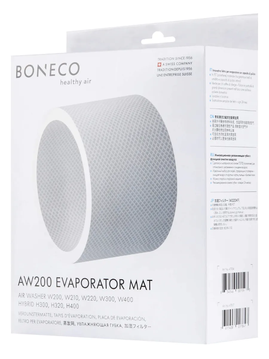 Boneco AW200 Evaporator Mat — оригинальная увлажняющая 3D-губка для совместимых моек воздуха и гибридных увлажнителей Boneco. Изготовлена из PET-материала, обеспечивает оптимальную производительность увлажнения и очистки, подходит для людей с аллергией и помогает задерживать крупные частицы, такие как пыльца и бытовая пыль.